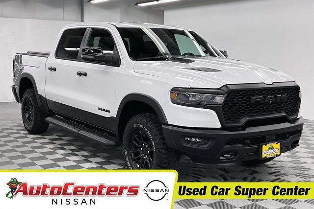 ZERO ACCIDENTS, Four Wheel Drive, 1500 Rebel, 4D Crew Cab, 4WD, Bright White Clearcoat, 115V Auxiliary Rear Power Outlet, 12-Way/1-Way Trailer Connector, 2-Door Passive Entry, Front Door Locks, 3.92 Rear Axle Ratio, 4G LTE Wi-Fi Hot Spot, ABS brakes, Accent Color Door Handles, Accent Color Premium Power Mirrors, Accent Color Tailgate Handle, Active Driving Assist System, Advanced Safety Group II, Apple CarPlay, Auto High-beam Headlights, Auto Power-Folding Mirrors, Auto-Dimming Exterior Driver Mirror, Automatic temperature control, Bed Utility Group, Black Painted Exterior Mirrors Caps, Connected Travel & Traffic Services, Connectivity - US/Canada, Convex Wide-Angle Exterior Mirror Insert, Delay-off headlights, Dome Dual LED Reading Lamp, Driver Seat Memory, Drowsy Driver Detection, Dual Wireless Charging Pad, Dual-Pane Panoramic Sunroof, Evasive Steer Assist, Exterior 115V AC Outlet, Exterior Mirrors Approach Lamps, Exterior Mirrors Courtesy Lamps, Exterior Mirrors w/Heating Element, Exterior Mirrors w/Memory, Exterior Mirrors w/Supplemental Signals, Front Bucket Seats, Front dual zone A/C, Front fog lights, Front Passenger Interactive Display, Fully automatic headlights, Google Android Auto, GPS Antenna Input, GPS Navigation, harman/kardon 19 Speaker Premium Sound, HD Radio, Heads-Up Display, Heated front seats, Heated Second Row Seats, Heated steering wheel, Illuminated entry, Integrated Voice Command w/Bluetooth®, Intersection Collision Assist System, LED CHMSL Lamp, Low tire pressure warning, Media Hub w/2 Charge Only USBs, MOPAR 4 Adjustable Cargo Tie-Down Hooks, Mopar Black Tubular Side Steps, MOPAR Spray In Bedliner, Off-Road Information Pages, Panic alarm, ParkView Rear Back-Up Camera, Power Adjust 8-Way Driver Seat, Power Adjust 8-Way Front Passenger Seat, Power Adjustable Pedals w/Memory, Power door mirrors, Power driver seat, Power steering, Power Tailgate, Power windows, Proximity Approach/Departure Lamps, Quick Order Package 21W Rebel, Radio: Uconnect 5 Nav w/14.4 Display, Radio/Driver Seat/Mirrors/Pedals Memory, Rain Sensitive Windshield Wipers, Rear Window Defroster, Rebel Level 2 Equipment Group, Remote keyless entry, Security Alarm, SiriusXM w/360L, Smartphone As A Key Capable, Speed control, Split folding rear seat, Steering wheel mounted audio controls, Surround View Camera System, Technology Group, Telescoping steering wheel, Tilt steering wheel, Traction control, Traffic Sign Recognition, USB Host Flip, Variably intermittent wipers, Wheels: 18 x 8.0 Painted Mid-Gloss Black. Odometer is 12904 miles below market average! Bright White Clearcoat 2025 Ram 1500 Rebel 4WD 8-Speed Automatic