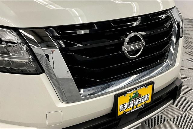 ONE OWNER VEHICLE, Four Wheel Drive, 3rd Row Seating, 2nd Row Captains Chairs, Platinum Captain Chairs Package, Pathfinder Platinum 4x4 - Pano Roof - Htd/Cooled Leather - 20'' Wheels, 4D Sport Utility, 4WD, Pearl White Tricoat/Super Black, 13 Speakers, 2nd-Row Captain Chairs, 2nd-Row Removable Center Console, 3rd row seats: bench, ABS brakes, Active Cruise Control, Air Conditioning, Auto High-beam Headlights, Auto tilt-away steering wheel, Auto-dimming Rear-View mirror, Automatic temperature control, Axle Ratio: 4.334, Black Splash Guards (Set of 4), Bodyside moldings, Bose Premium Audio System, Bumpers: body-color, Cross Bars, Delay-off headlights, Exterior Parking Camera Rear, Front Center Armrest, Front dual zone A/C, Fully automatic headlights, Garage door transmitter: HomeLink, Heads-Up Display, Heated & Cooled Front Bucket Seats, Heated door mirrors, Heated rear seats, Heated steering wheel, Illuminated entry, Leather steering wheel, Low tire pressure warning, Memory Driver Seat, Navigation system: NissanConnect Navigation, NissanConnect w/Navigation & Services, Outside temperature display, Panic alarm, Platinum Captain Chairs Package, Power door mirrors, Power driver seat, Power Liftgate, Power moonroof, Power passenger seat, Power steering, Power windows, Prem Paint & 2-Tone Roof - Pearl White Tricoat, Radio data system, Radio: AM/FM Audio System, Rain sensing wipers, Rear air conditioning, Rear window defroster, Rear window wiper, Reclining 3rd row seat, Remote keyless entry, Semi-Aniline Leather Seating Surfaces, Sirius XM Radio, Speed-sensing steering, Speed-Sensitive Wipers, Split folding rear seat, Steering wheel memory, Steering wheel mounted audio controls, Telescoping steering wheel, Tilt steering wheel, Traction control, Turn signal indicator mirrors, Variably intermittent wipers, Wheels: 20 Machined Alloy w/Dark Met Gray Finish. Odometer is 4584 miles below market average! Pearl White Tricoat/Super Black 2023 Nissan Pathfinder Platinum 4x4 - Pano Roof - Htd/Cooled Leather - 20'' Wheels 4WD 9-Speed Automatic
